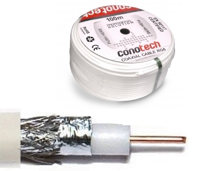 Wysokiej jakości , potrójnie ekranowany kabel koncentryczny typu RG6 o żyle wewnętrznej wykonanej z drutu miedzianego, izolacja polietylenowa spieniana fizycznie azotem (N), pokryta folią aluminium/PET, oplotem z drutów aluminiowych i kolejną folią aluminium/PET oraz powłoką polwinitową PVC.