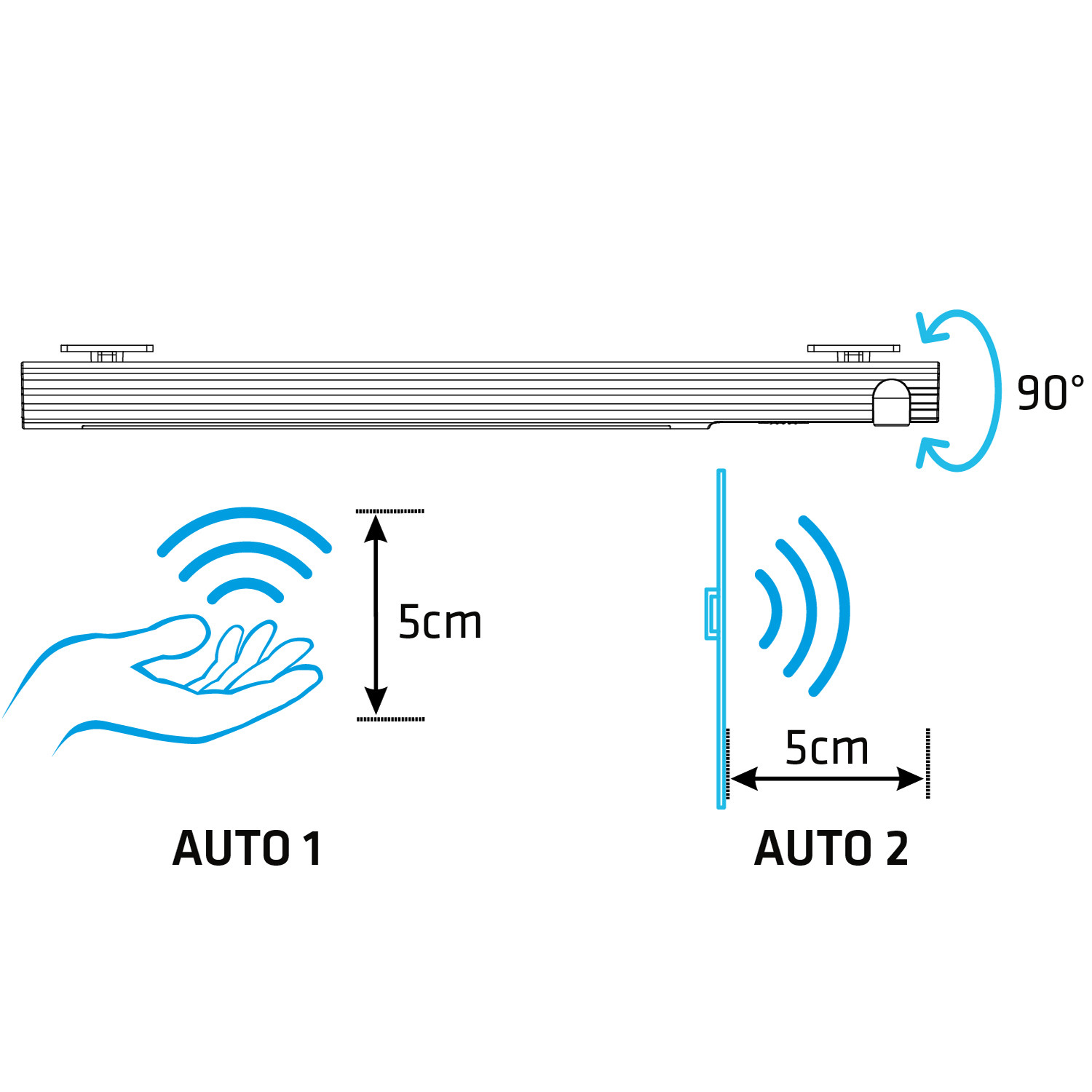 3. Ustaw przełącznik w pozycji AUTO2, czujnik wejdzie w tryb wykrywania ruchu, a światło LED w tryb stand-by. Tryb do zastosowania w szafkach lub garderobie. Czujnik reaguje w odległości 5cm od ruchu szafki, drzwi garderoby etc. i automatycznie uruchamia światło. Po zamknięciu szafki lub drzwi garderoby czujnik po chwili wyłączy światło.