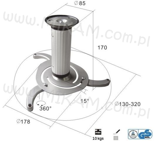 Uniwersalny sufitowy uchwyt do projektora o wadze nie przekraczjącej 10kg. Trzy niezależne ruchome ramienia umożliwiają zamocowanie dowolnego projektora. Bardzo wysoka jakość wykonania, Solidna, metalowa konstrukcja. Kolor srebrny.