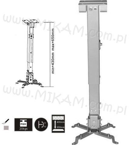 - Odległość projektora od sufitu 120mm bez ramion przedłużających, 430mm-650mm z zamontowanymi ramionami przedłużającymi