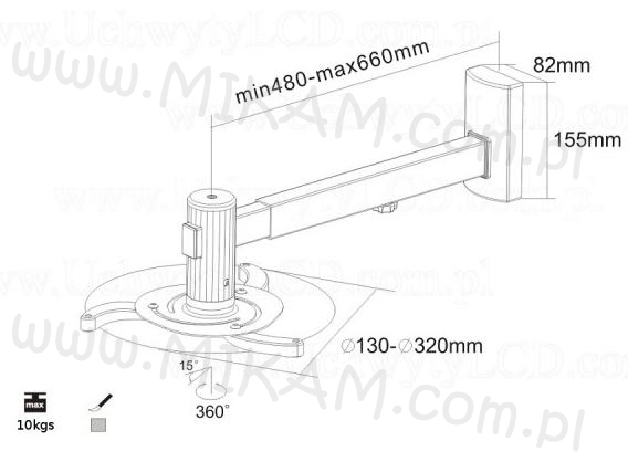 Uniwersalny uchwyt pod projektory multimedialnego. Udźwig do 10kg. Maksymalna odległość między śrubami montażowymi projektora 320 mm, regulowane ramiona do montażu dowolnego projektora multimedialnego. Możliwość regulacji kąta 360° wokół własnej osi oraz 15° góra - dół .