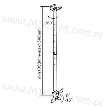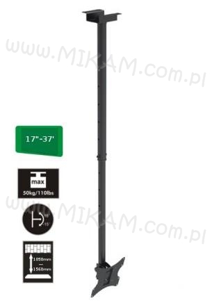 Uniwersalny , wysokiej jakości sufitowy uchwyt do telewizorów i monitorów LCD LED o przekątnej z zakresu od 15 do 42" (a nawet więcej - wszystko zależy od kryterium wagowego) z możliwością regulacji w pionie ( -/ +15 ° w górę i w dół) i poziomie (360 °). Maksymalny ciężar telewizora 50 kg.